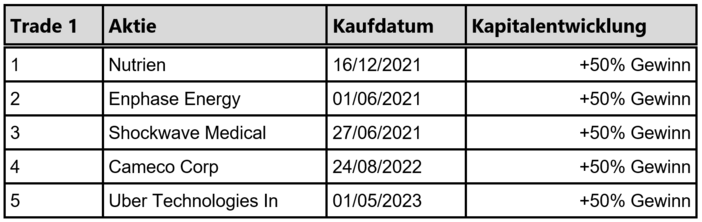 Du kannst aber sicher davon ausgehen, dass du durchschnittlich einen Gewinn von + 50 % bei jedem Handel erzielen kannst! Selbst wenn ein Handel einmal im Verlust endet, ist das Risiko bei den Anfängertrades dank des 5:2-Trading-System auf maximal -20 % pro Aktientransaktion begrenzt!