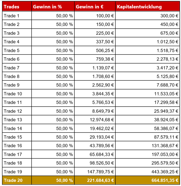 Sieh dir hier in der Tabelle an, wie sich dein Minieinsatz von 200 Euro bei +50 % Gewinn und mit 20 Trades in nur einem Jahr entwickeln würde: